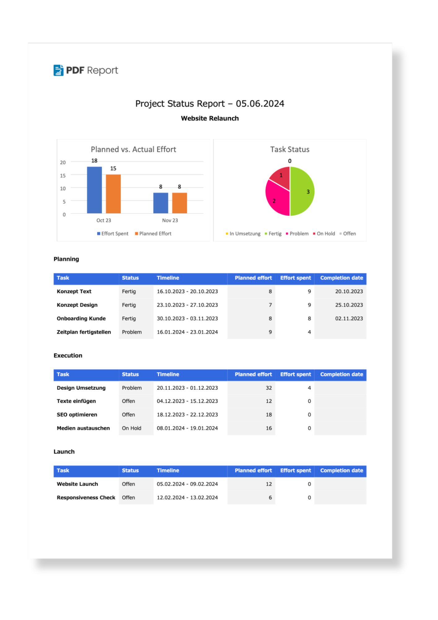 In this example, charts have been added to an Project Status Report. You can use your generated charts to prepare your reports graphically and display data in an understandable way.