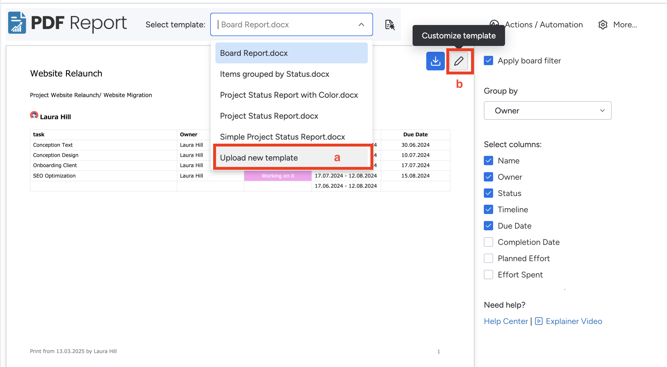 Now the template is ready to go. Select the 'PDF Report Generator' view in your board and either\