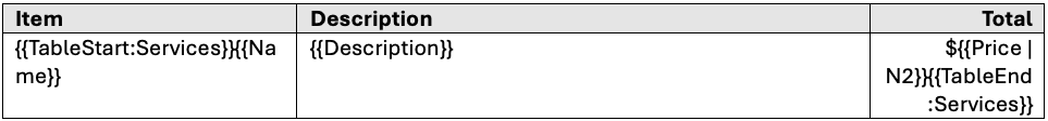 **`{{TableStart:Services}}`** and **`{{TableEnd:Services}}`**