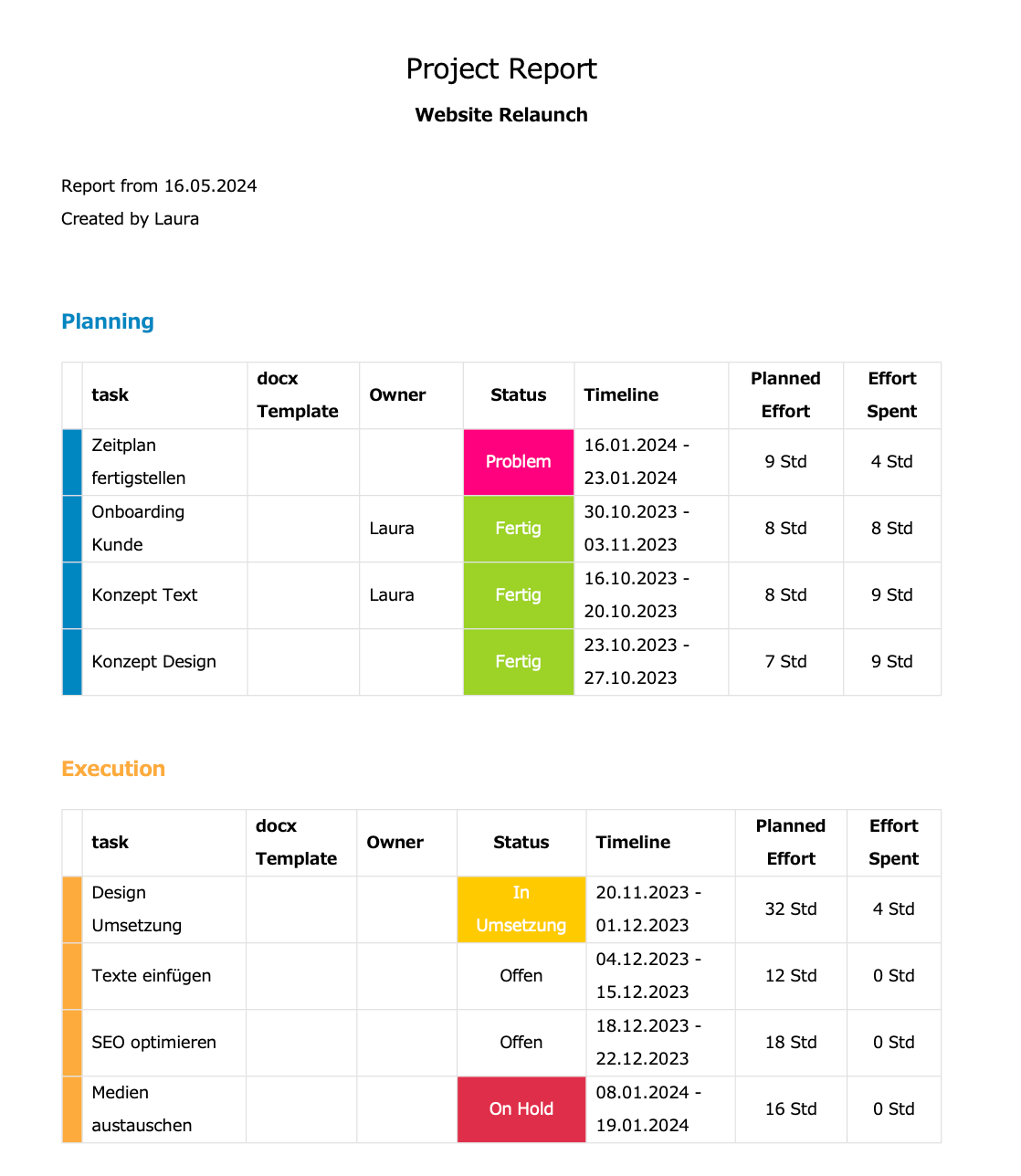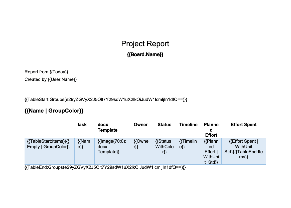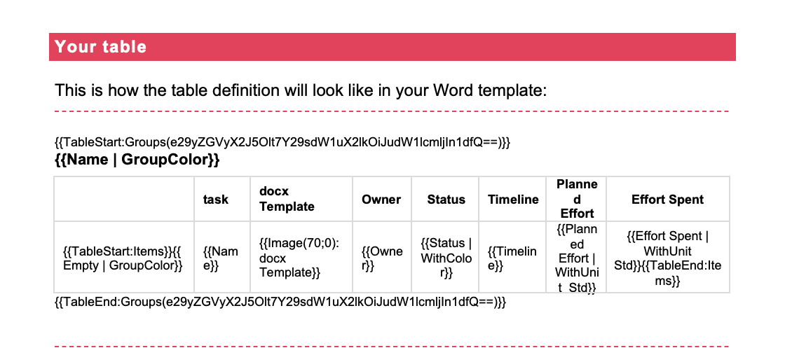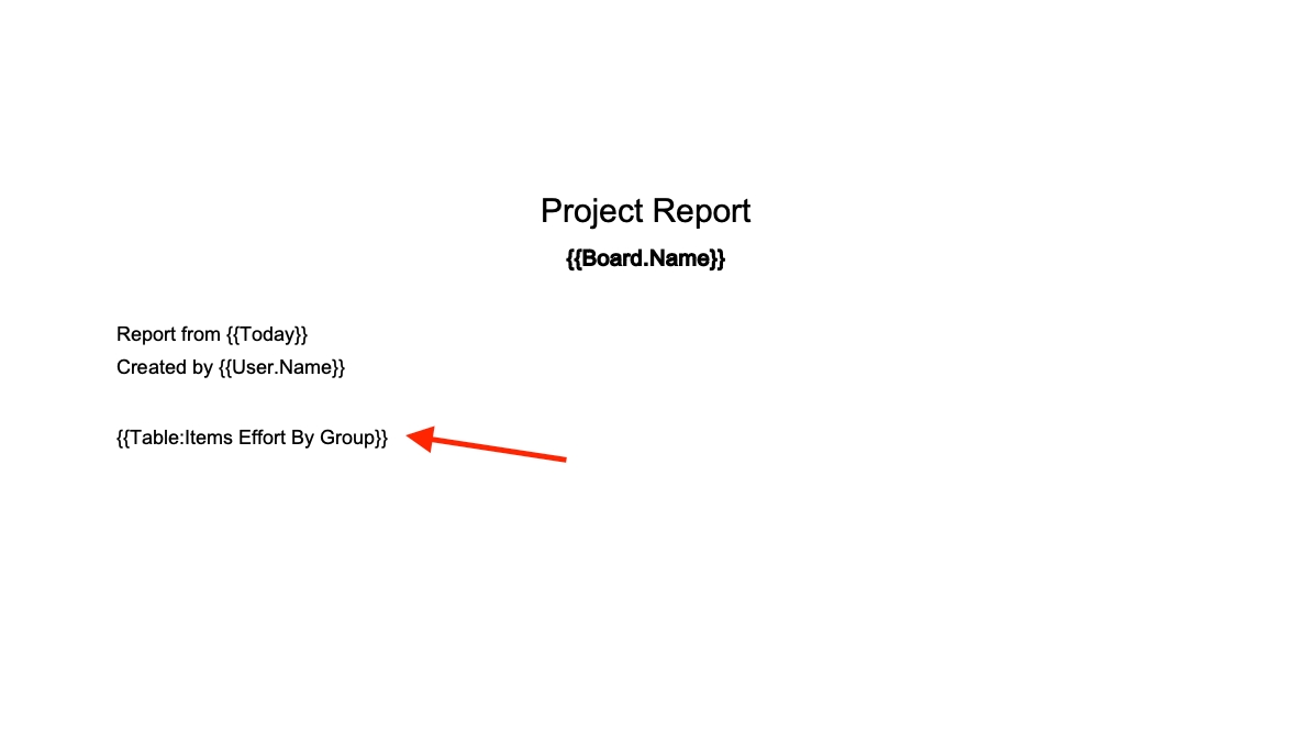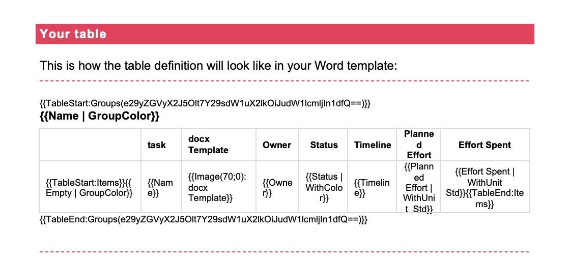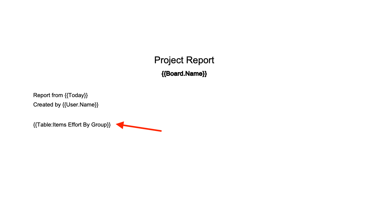 Option 1: Insert the placeholder for the table into your Word template, in this case {{Table:Items Effort by Group}}