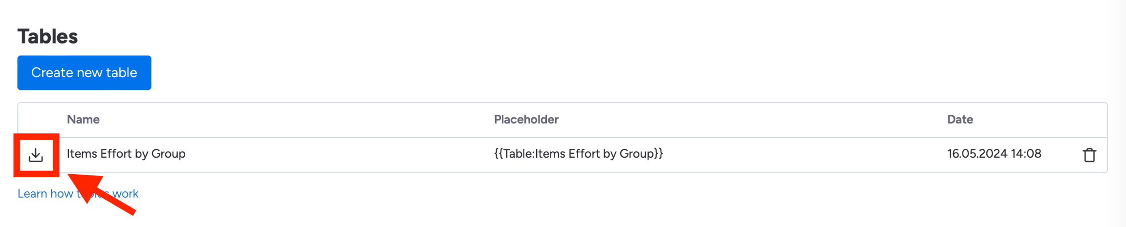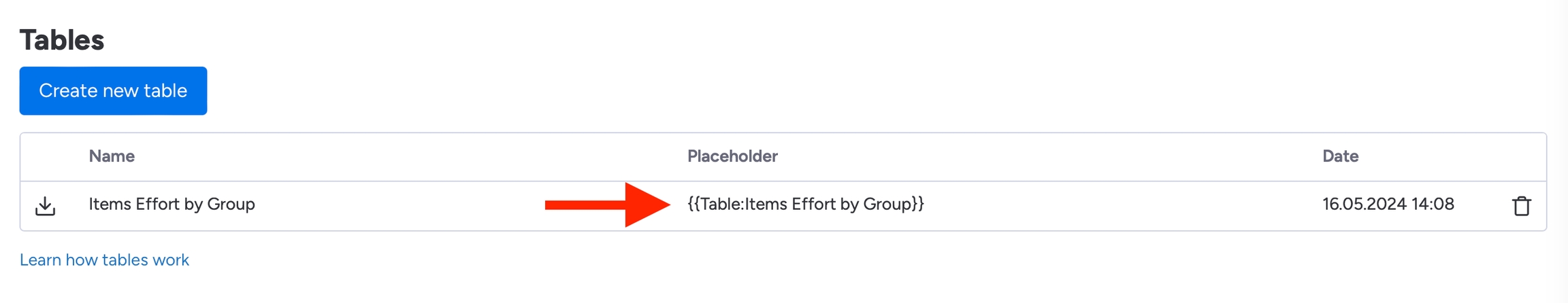 For each table a specific placeholder is generated. You'll find the name of the placeholder next to the name of your table. This means that the whole table you defined (incl. groups) can be displayed by only inserting this placeholder into your template.